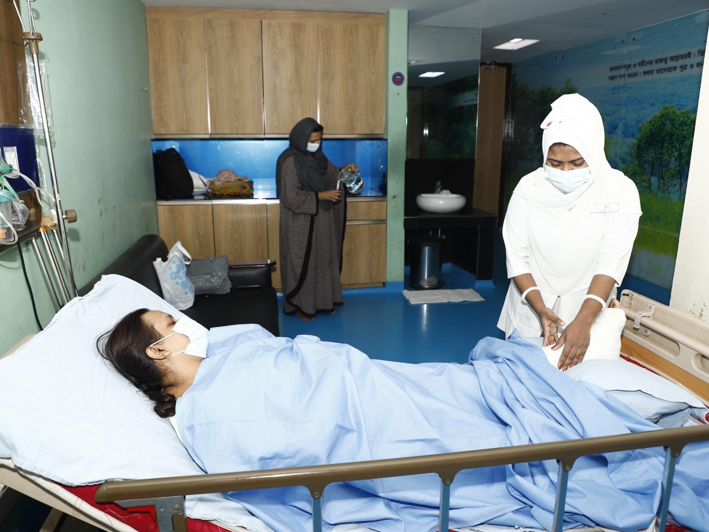 There is a total of 82 cabins including the executive cabins in AWMCH to serve patients with outstanding care and modern amenities at a reasonable rate. Each cabin has one bed for the patient and one floor bed for their attendant.