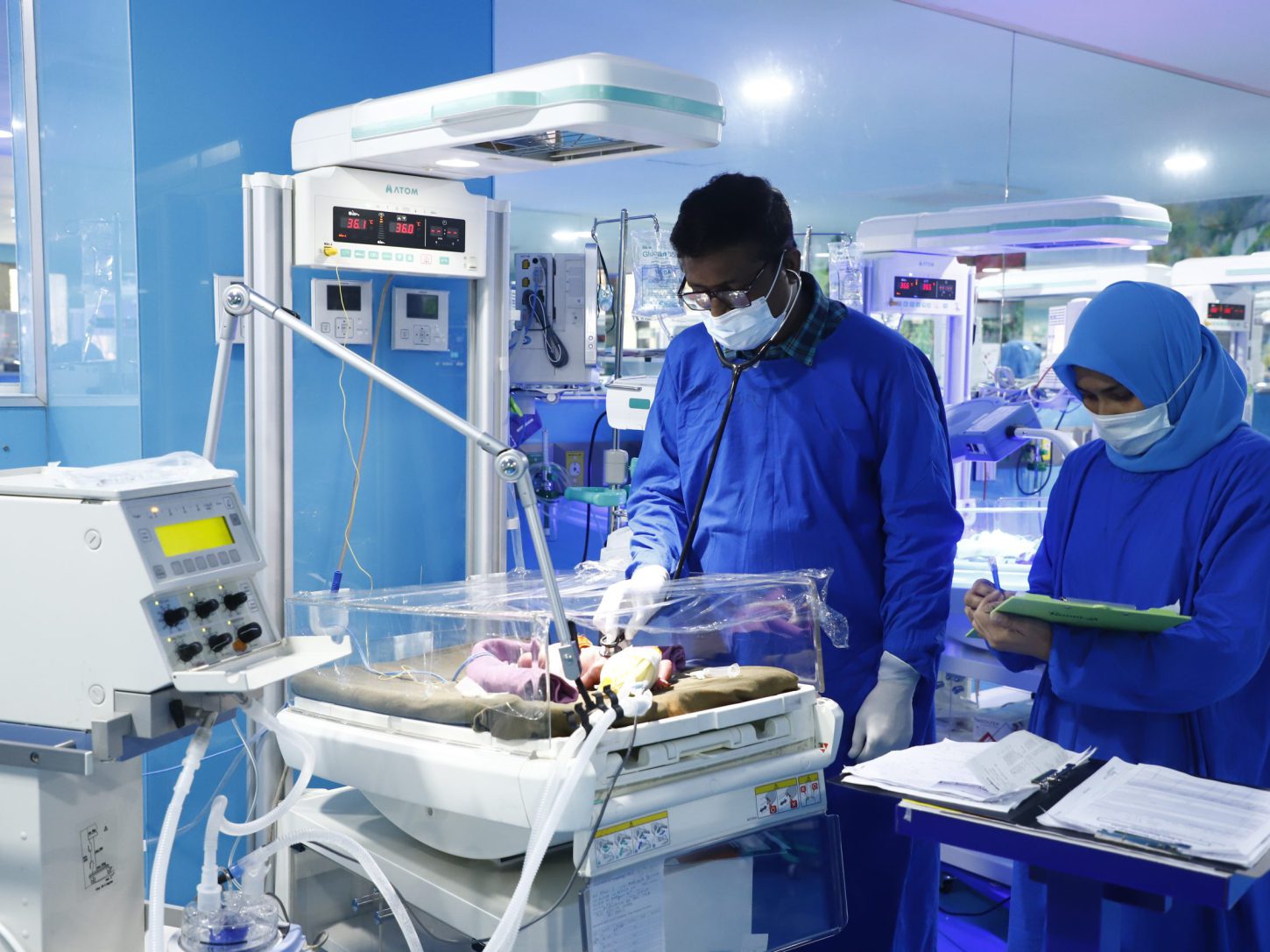 The Neonatal Intensive Care Unit (NICU) is located at the 5th floor of the Ashraf Ali Building, which specializes in the monitoring and care of ill or premature new-born infants. The NICU also admits babies with congenital problems or trauma during delivery and combines sophisticated equipment with trained healthcare professionals to provide specialized care for newborn infants. The 100-bed-unit consists of numerous child specialists, assisted by 100 nurses and 4 receptionists.